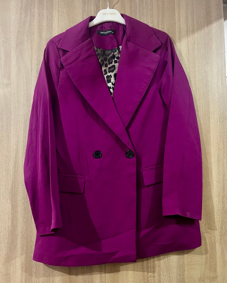 Düğmeli, uzun kollu ve regular fit mor kadın blazer ceket. Notch yaka ve baskılı astar ile ofis ve günlük kullanım için uygundur.