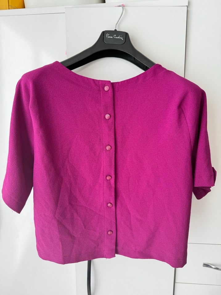 Mor renkli kadın bluz, yuvarlak yaka ve kısa kolludur. Sırt kısmında düğmeler bulunur, bol kesim ve midi boydadır. Düz, normcore tarzda, günlük kullanım için uygundur.