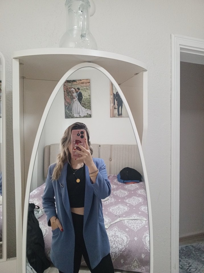Pastel mor renkte, düğmeli, notalı yaka ve uzun kollu, bol kesim midi uzunluğunda denim ceket. Günlük kullanıma uygun sade tasarım.