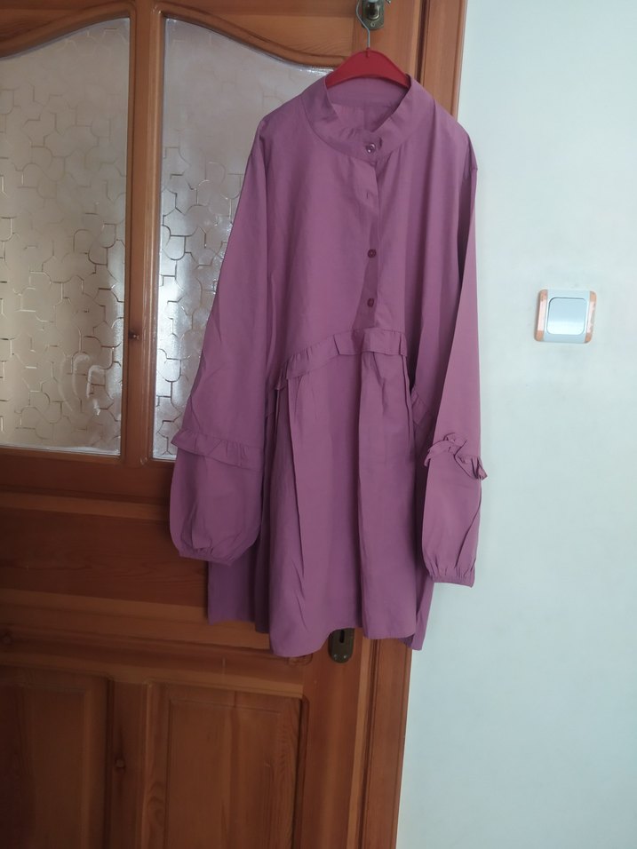 Mor keten kumaştan, düğmeli, yüksek yakalı, bol kesim uzun kollu minimal tarzda kadın tunik.