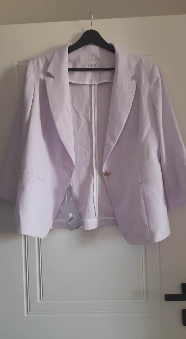 Düğmeli, kısa kollu, normal kesim mor kadın blazer. İpeksi kumaştan, ofis için uygun midi uzunlukta pastel renk.