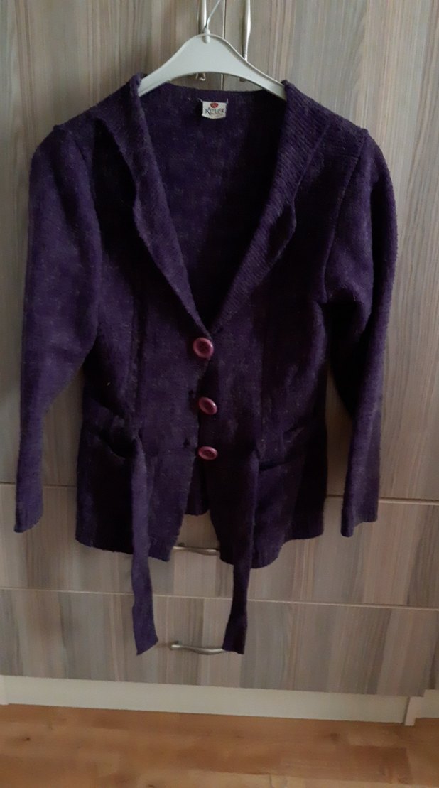 Düğmeli, yakalı ve uzun kollu bu mor kadın kaban, ince kesimi ve yumuşak dokusuyla rahat bir kullanım sunar.