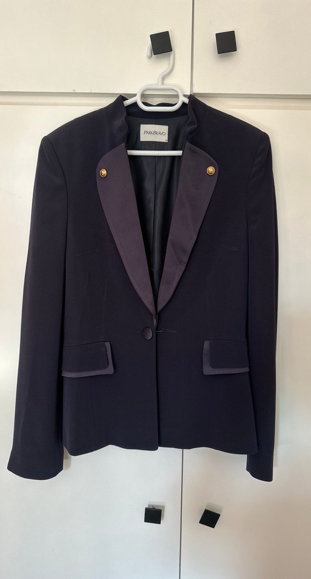 Düğmeli ve normal boyda, lavivert kadın blazeri. Notch yakalı, uzun kollu ve ofis kullanımı için uygun, ipeksi dokulu klasik tasarım. Yakası ve ceplerinde saten dokunuşları mevcuttur.