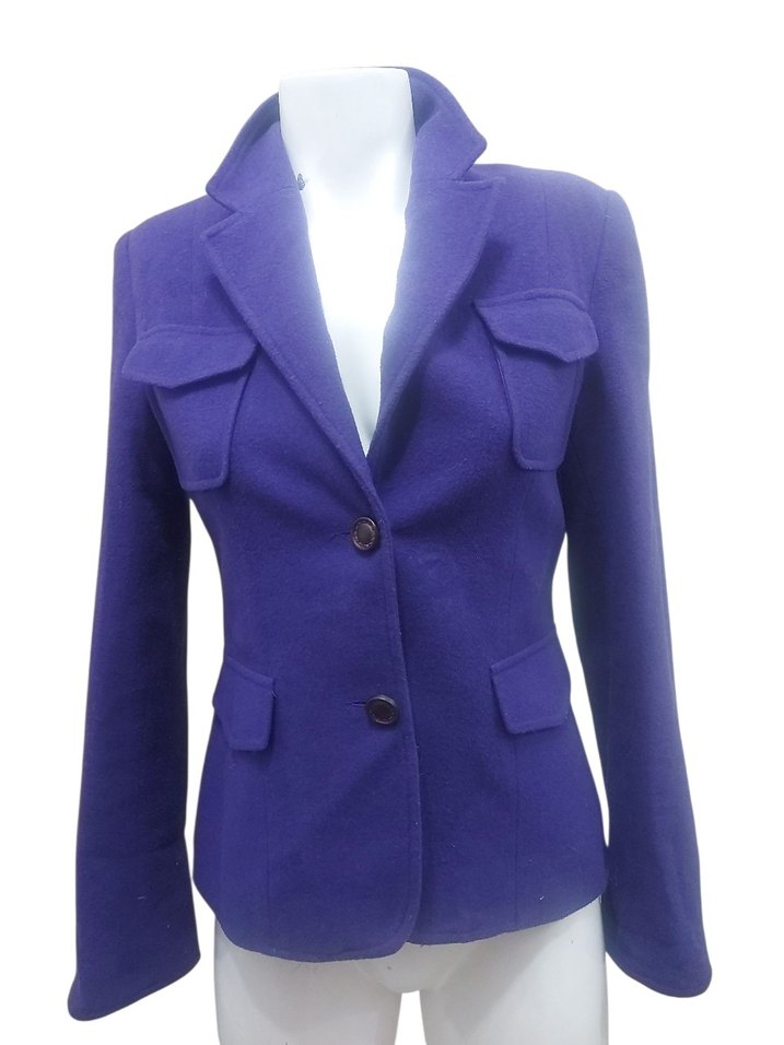 Düğmeli, notched lapel yaka ve uzun kollu koyu mor kadın blazer. Normal boy ve rahat kesim, yumuşak ve sıcak kumaştan, ofis kullanımı için uygun.