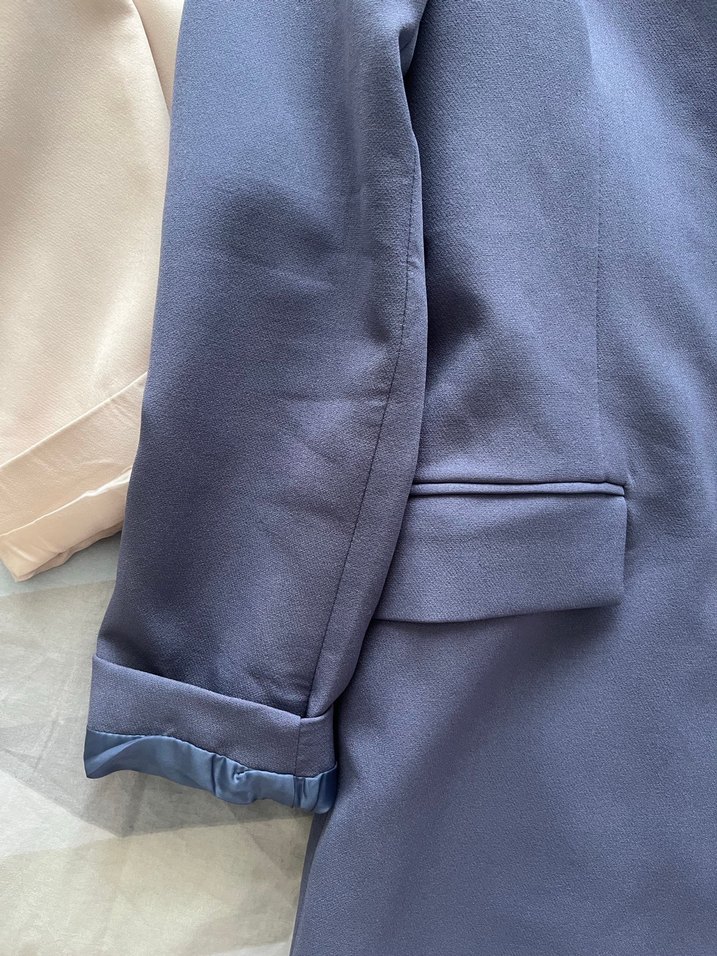 Mavi renkli, düğmeli, normal kesim ve uzun kollu kadın ofis blazeri. İpeksi dokusu ve klasik yakasıyla şık bir seçim.