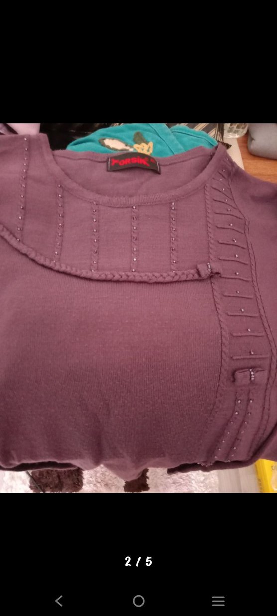 Mor renkli, bisiklet yaka ve uzun kollu, triko kumaştan yapılmış, günlük kullanıma uygun bohem tarzda kadın kazak.