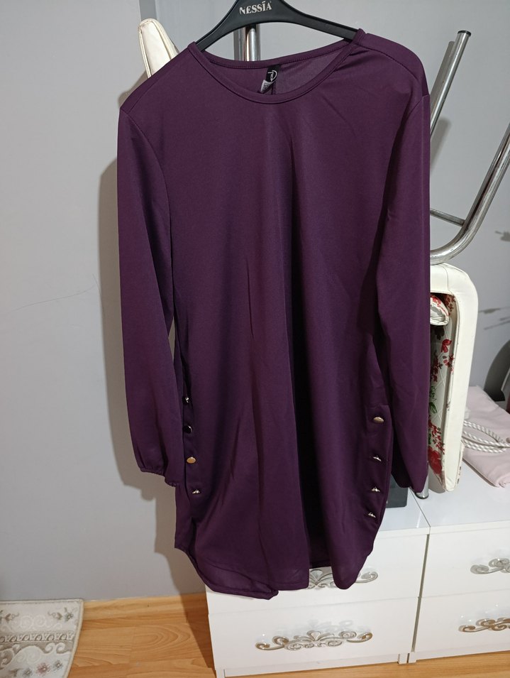 Düğmeli detaylı, uzun kollu, yuvarlak yakalı, bol kesim midi tunik. Koyu mor renkte, sentetik kumaştan üretilmiştir. Günlük sokak stili için uygundur.