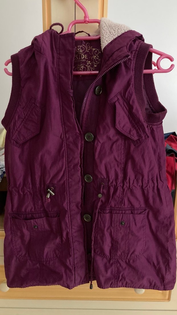 Düğmeli ve cepli, mor renkte, normal boy midi yelek. Kolsuz, bol kesim ve notched lapel yakaya sahip, günlük rahat kullanıma uygun.