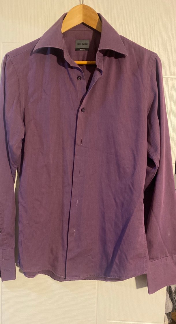 Düğmeli, kesik yakalı ve parlak mor keten kumaştan uzun kollu erkek gömleği. Normal kesim, ofis için uygun.