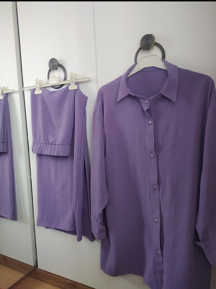 Mor keten gömlek, düğmeli ve uzun kollu tasarıma sahiptir. Normal kesim ve minimal desensiz yapısıyla sade bir şıklık sunar.