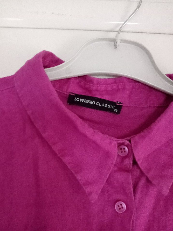 Düğmeli, kısa kollu, yakalı, bol kesim mor keten gömlek, günlük rahat stil için uygundur.