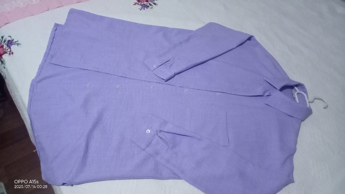 Düğmeli, keten kumaştan yapılmış, mor renkte, normal kesim ve uzun kollu tunik Salaş ve günlük kullanım için uygundur.iki kol arası 62 cm boyu 88-90 cm