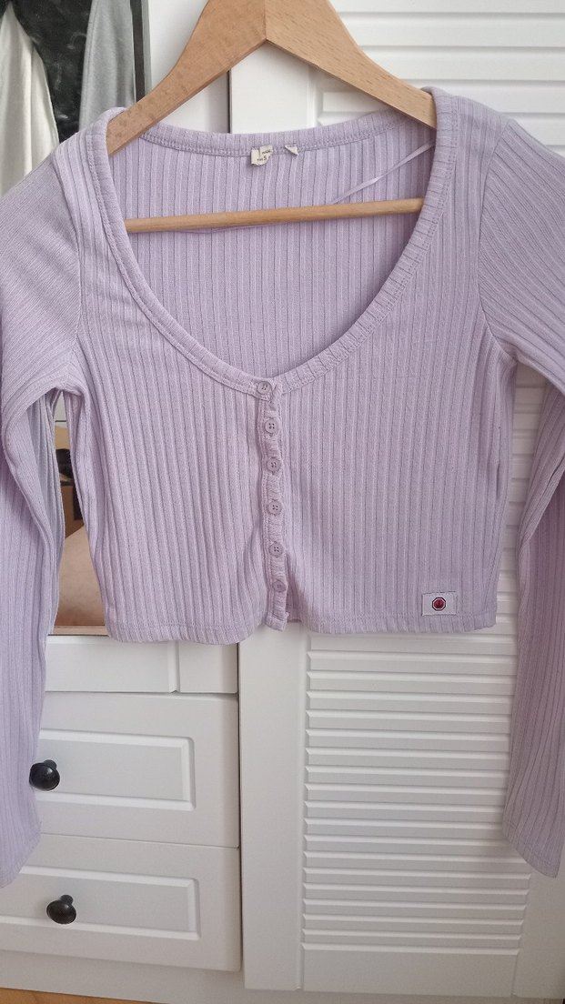 Düğmeli, uzun kollu, fitted kesim ve pastel mor renkte kız çocukları için örme hırka, streetwear tarzına uygun.