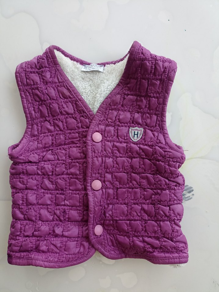 Düğmeli, mor renk kız çocuk yeleği, notlu yaka ve kolsuz tasarıma sahiptir. Yumuşak, sıcak dokulu kumaştan üretilmiş, rahat kesimlidir.