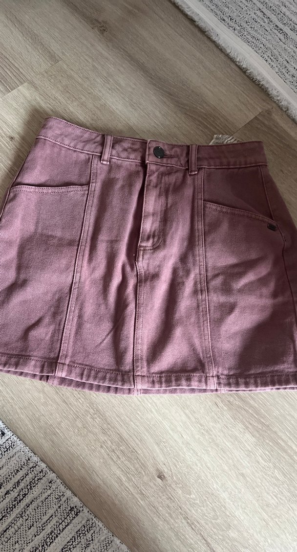 Düğmeli, pastel mor renkte kot mini etek. Rahat kesimi ve sade tasarımıyla günlük sokak stiline uygun.
