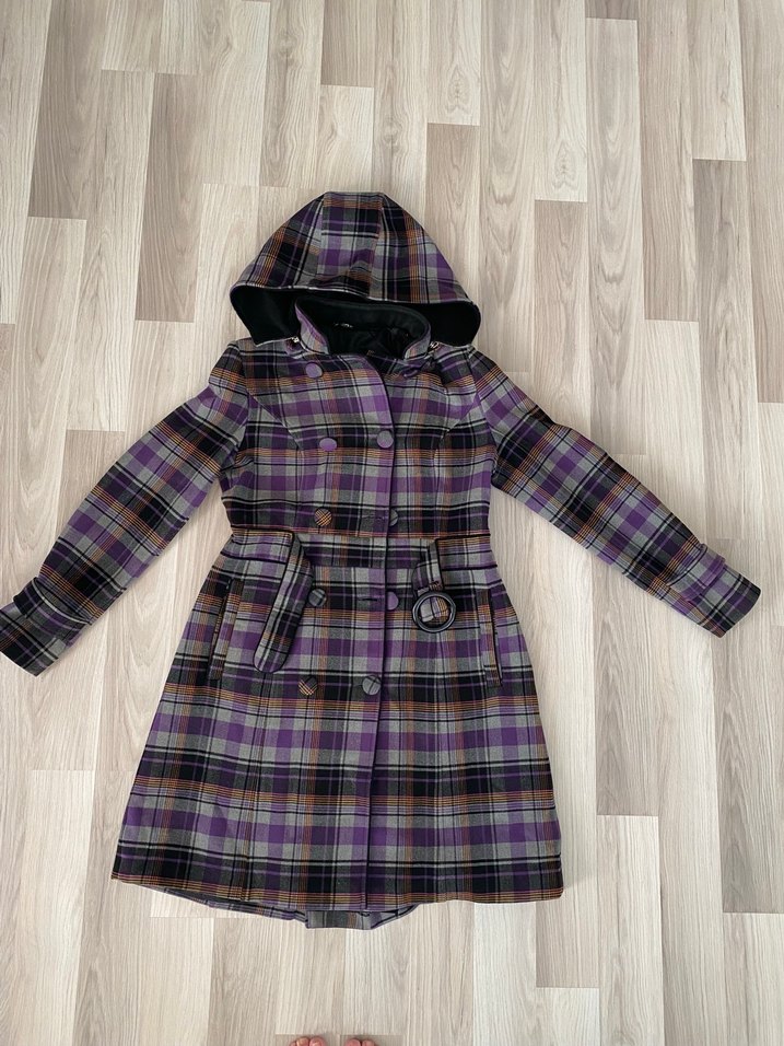 Düğmeli, mor midi kaban, kesimi vücuda oturur. Notlu yaka, uzun kollu ve bağlama düğmeli. Rahat, yumuşak kumaşlı, bağlama desenli.ASTARININ DURUMU SEBEBİYLE FİYAT DÜŞÜK