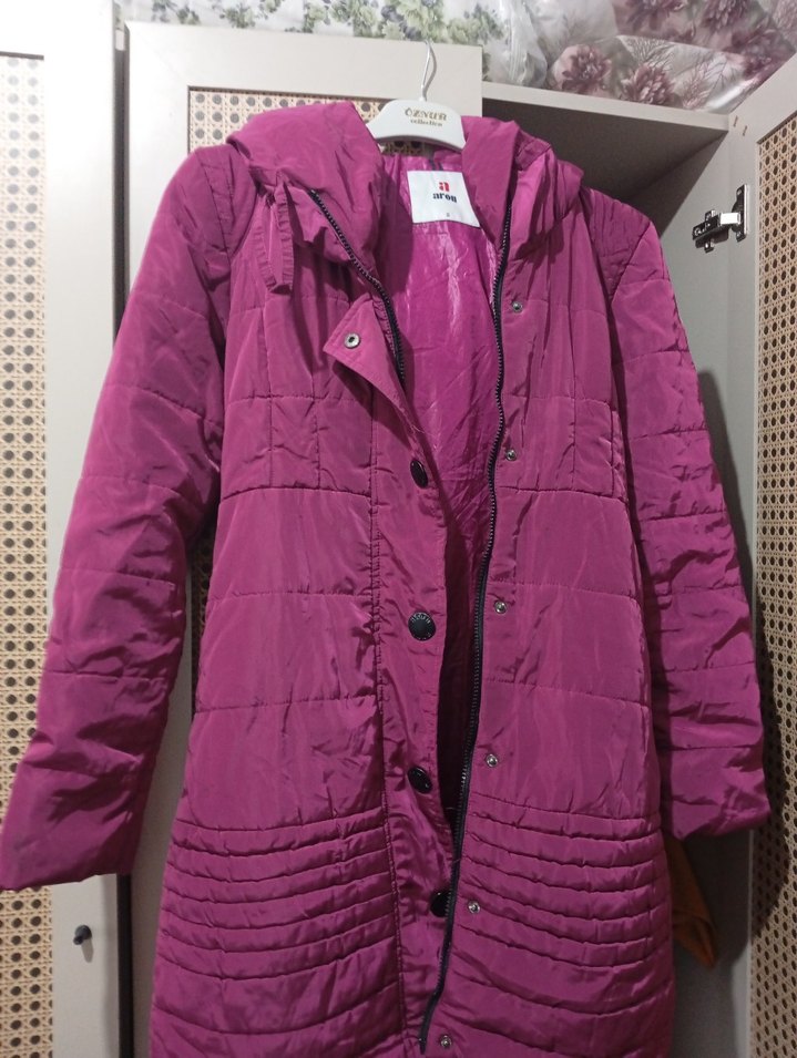Parlak mor renkte, düğmeli ve kesik yaka detaylı kadın montu. Normal kesim, uzun kollu ve midi boyda, yumuşak sentetik kumaştan günlük sokak stili için uygun.