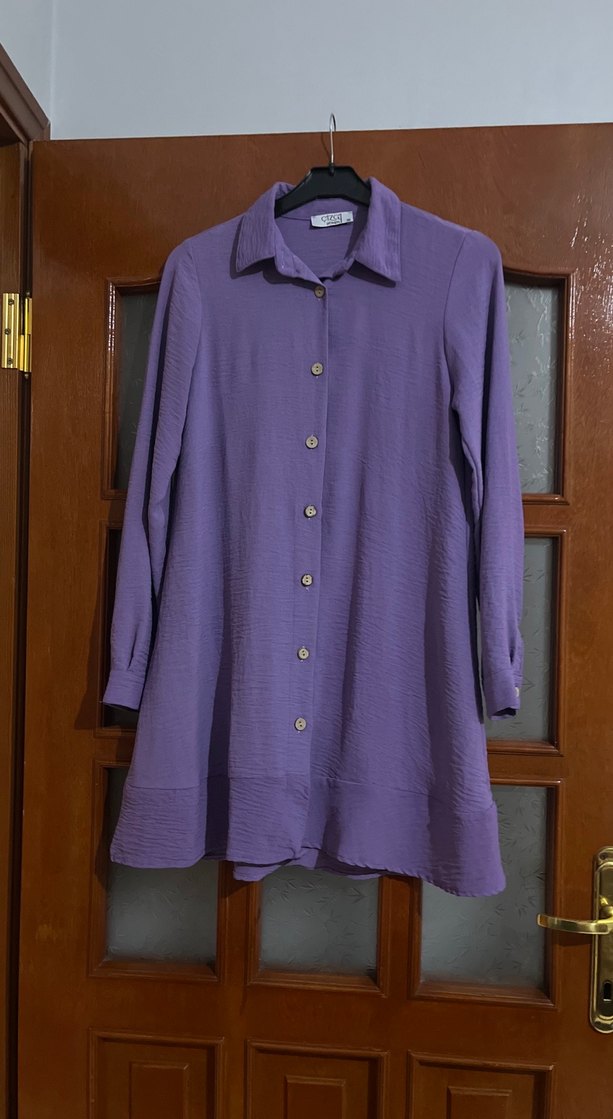 Mor renginde, keten kumaştan, uzun kollu, düğmeli ve normal boy midi tunik. Rahat kesimi ve yakası notched lapel tarzında, günlük kullanıma uygun.