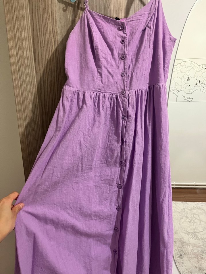 Düğmeli, askılıksız, kolsuz, bol kesim mor keten midi elbise. Bohem tarz için uygundur.