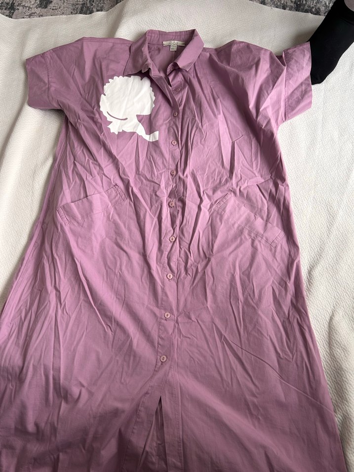 Pastel mor renkte, pamuklu kumaştan yapılmış, kısa kollu, düğmeli ve yakalı hamile gömlek elbisesi. Bol kesimi ve midi boyu günlük kullanım için uygundur. koltuk altı en 62 cmdir esnek olduğu için rahatlıkla giyilebilir omuzdan boy 105 cm dir yurt dışı ürünüdür