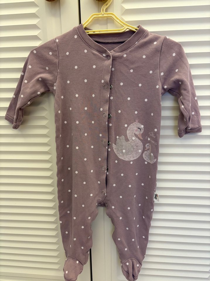 Düğmeli, beyaz puantiyeli mor kız bebek tulumu, kuğu baskılı. Yumuşak ve rahat kumaş, ayaklı 6-9 ay uyumlu