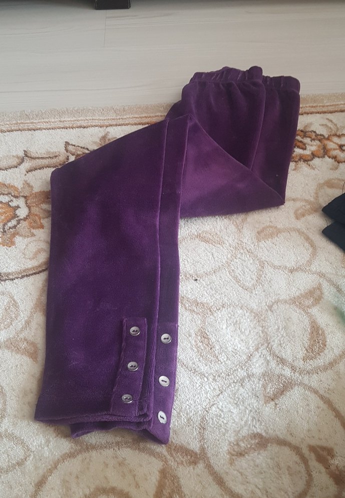 Parlak mor süet kumaştan yapılmış, düğmeli ve vücuda oturan kız taytı. Gotik tarzda sade bir tasarım sunar.