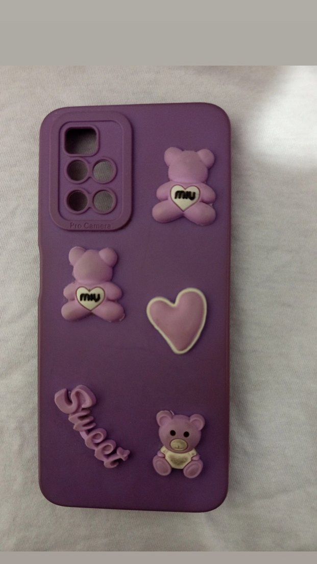 Düğmeli ayıcık ve kalp süslemeleriyle pastel mor renkli redmi 10 telefon kılıfı, yumuşak normcore tarzında. kullanilmiştir fotoğrada bellidir.