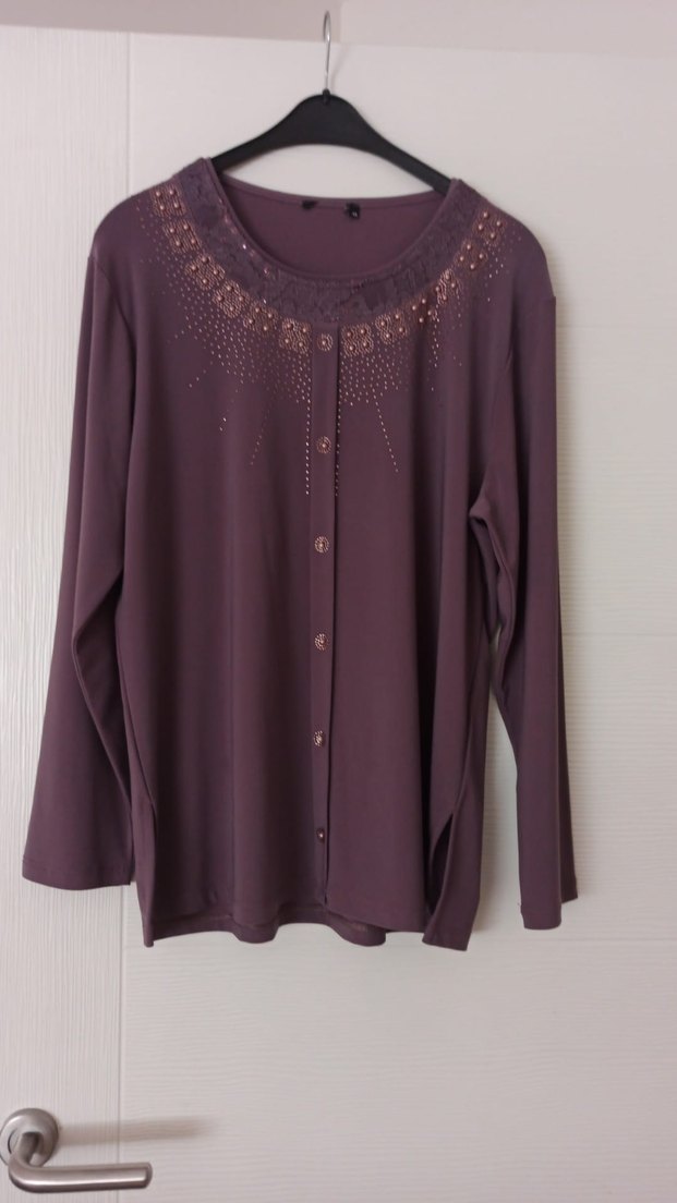 Mor triko kumaştan, düğmeli, uzun kollu ve yuvarlak yakalı, rahat kesim kadın bluz. Midi boyda ve desen içermeyen minimalist tasarıma sahiptir.