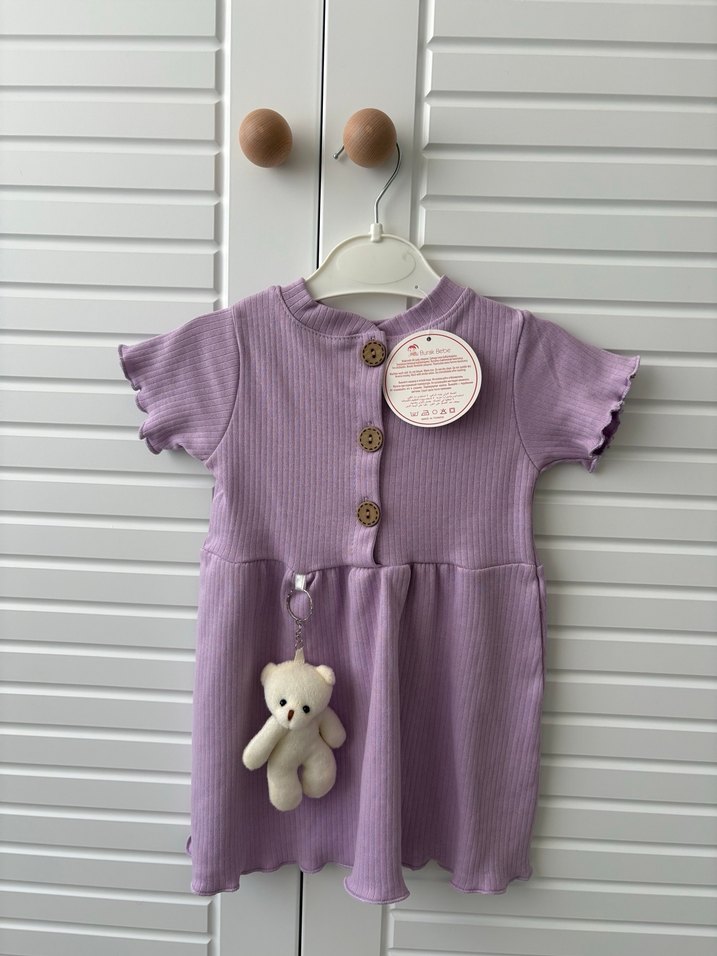 Düğmeli, kısa kollu, yuvarlak yakalı, pastel mor triko kız elbisesi. Rahat kesimli ve baskılı tasarıma sahip. Küçük ayıcık aksesuarı ile tamamlanmıştır.