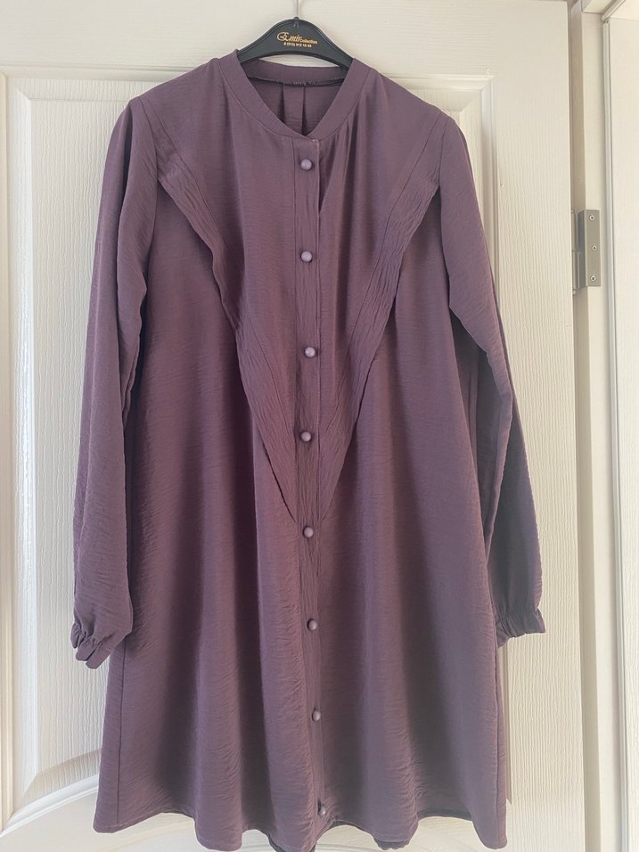 Düğmeli, uzun mor ayrobin tunik. Yüksek yakalı ve uzun kollu, bol kesim, kendi dikimimdir..Günlük kullanıma uygun. Boy uzunluğu 90 cm iki kol arası 55 cm Kol uzunluğu 60 cm