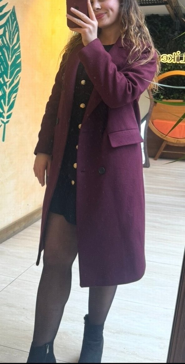 Düğmeli çift sıra düğmeli ve kapaklı cepleri olan uzun mor kaban, şık ve zarif bir görünüm sunar.