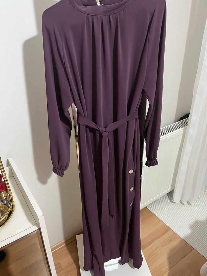 Düğmeli, yüksek yakalı, uzun kollu ve bol kesim mor uzun elbise. Sentetik kumaştan, belde kuşaklı, ofis için klasik Paris esintili stil sunar.