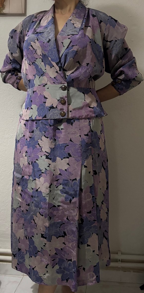 Kadınlar için uzun boy, düğmeli, notched lapel yakalı, kısa kollu, ipeksi kumaştan, pastel mor tie-dye desenli, vintage ve çağdaş tarzda ofis takımı.