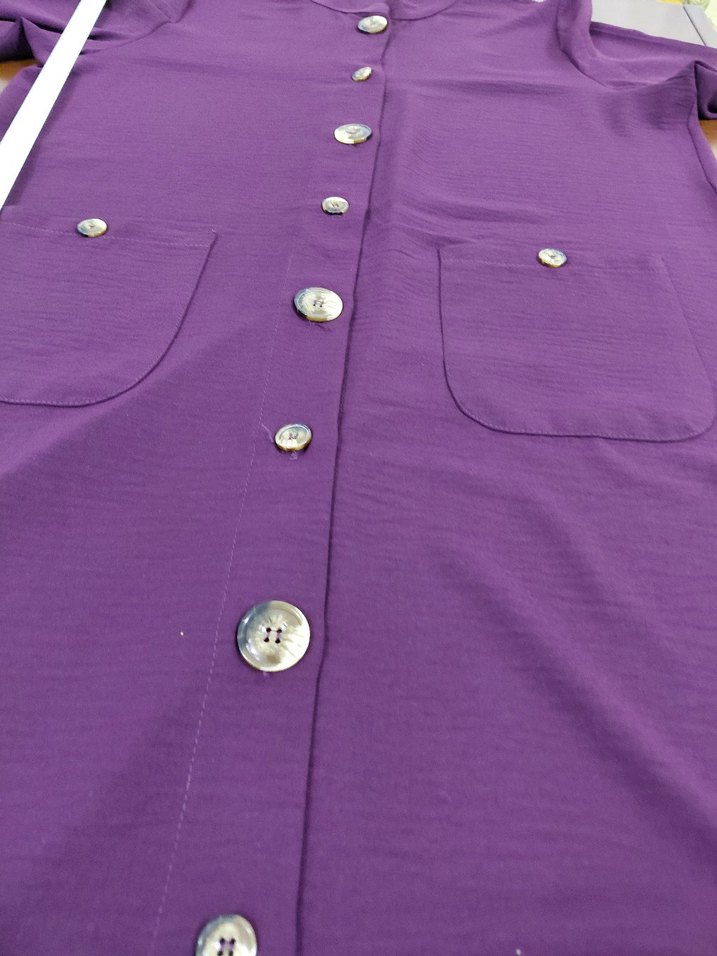 Düğmeli, mor renkli, uzun kesim kap ayrobin kumaş kolunda ütü izi var giyilmedi.hiç