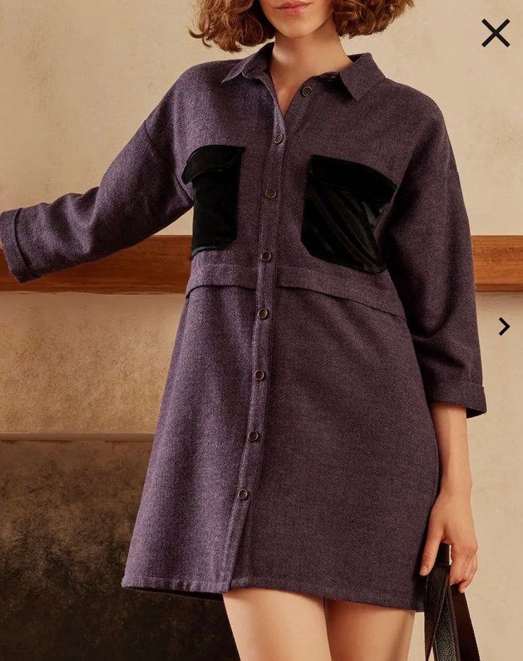 Düğmeli ve yakalı mor uzun kollu elbise, sentetik ve yün kumaştan üretilmiştir. Günlük kullanıma uygun, kadife cep detayları ile çok şık 34-36 beden uyumlu