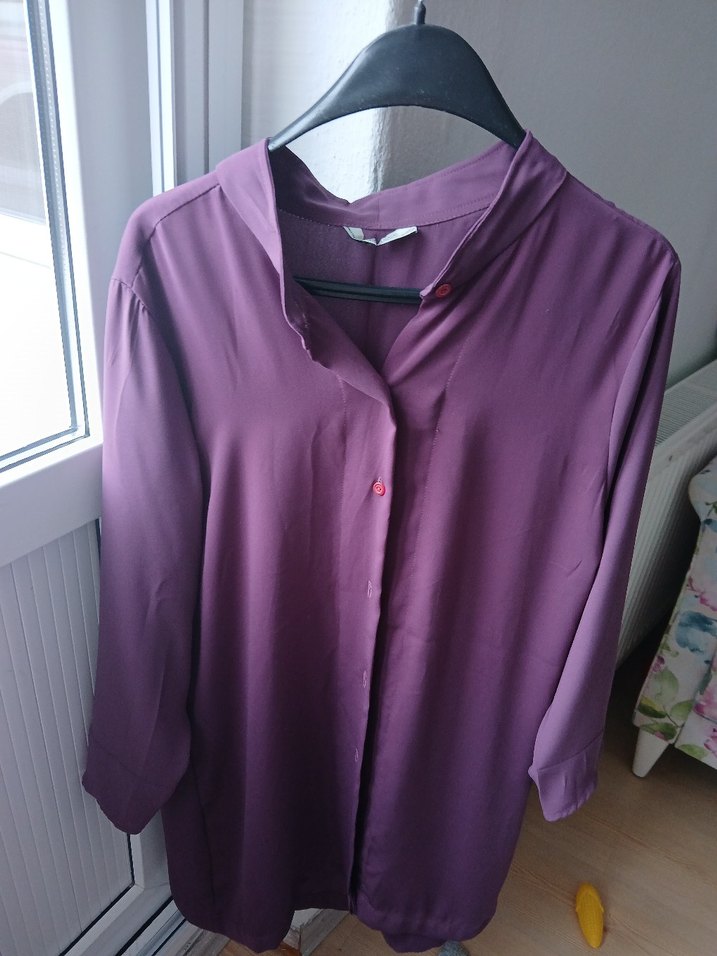 Düğmeli, V yakalı, parlak mor renkte, bol kesim hamile bluzu. İpek gibi kumaştan, uzun kollu ve midi boyda, günlük kullanıma uygun.