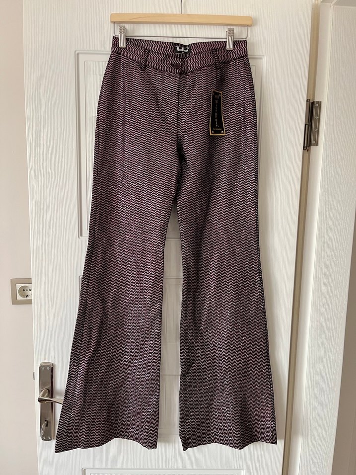 Düğmeli, parlak mor yılan desenli, ipeksi kumaştan, midi boy, bol kesim kadın kumaş pantolon. Ofis ve iş kombinlerine uygun. Vintage simli şık pantolon