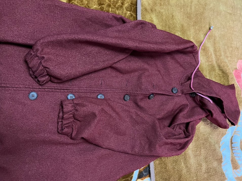 Düğmeli ve kol lastikli, yumuşak kumaştan yapılmış mürdüm renk kaban.