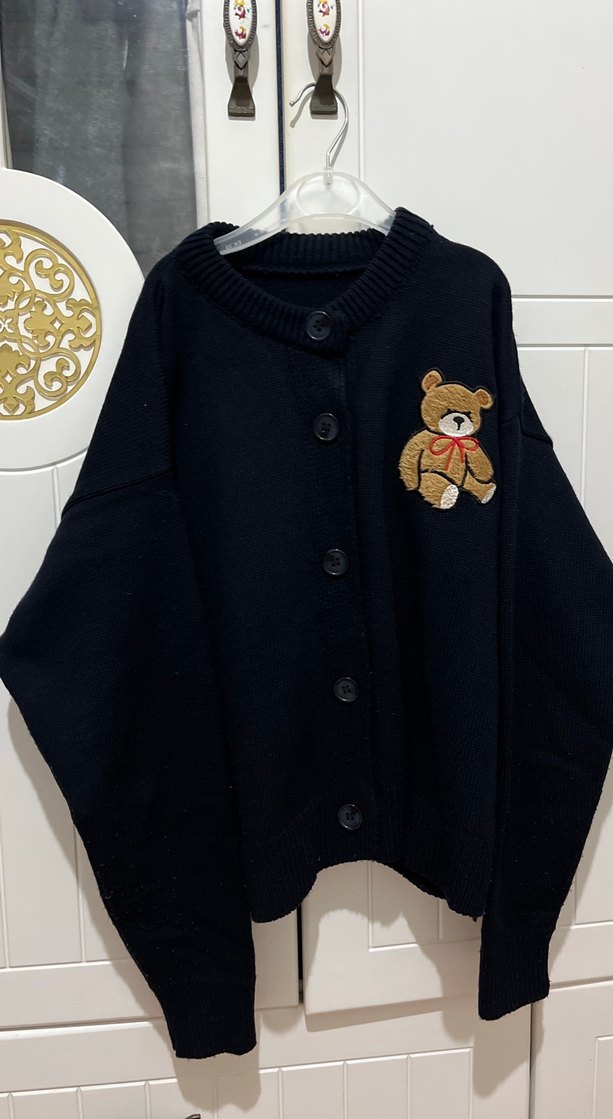 Düğmeli, yuvarlak yaka ve uzun kollu bu bol kesim triko hırka, kahverengi nakışlı ayıcık detayıyla günlük kullanıma uygundur.