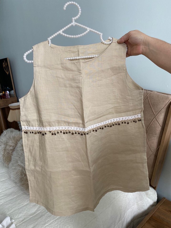 Bej renkli keten kumaştan, nakış detaylı ve düğmeli kolsuz bol kesim bluz. Yuvarlak yakalı, midi boy ve günlük kullanıma uygun.