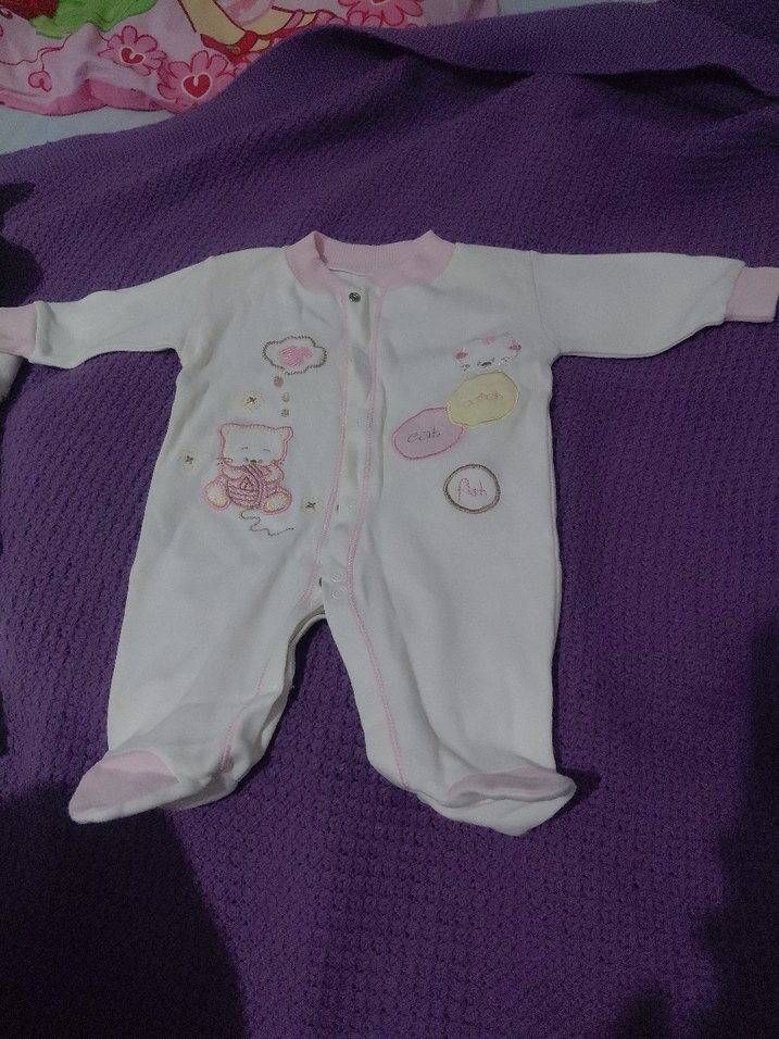 Düğmeli ve nakışlı pastel desenlere sahip beyaz bebek tulumu, yumuşak ve rahat bir kullanım sunar.