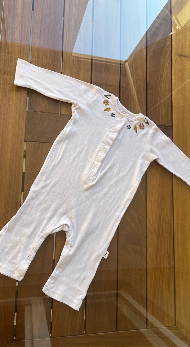 Düğmeli ve göğüs kısmında zarif çiçek nakışları bulunan beyaz bebek tulumu, yumuşak kumaştan üretilmiştir.