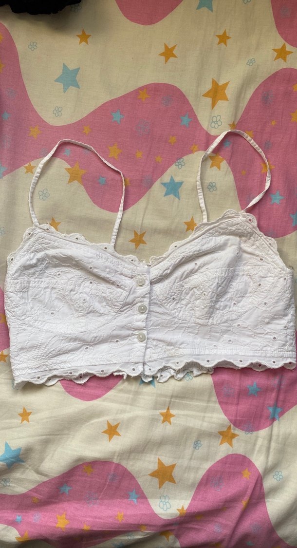 Düğmeli, nakışlı beyaz pamuk bustiyer. İnce askılı, bohem tarzda ve vücuda oturan kesim.