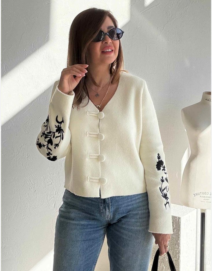 Düğmeli, V yakalı beyaz örme hırka, bol kesim ve uzun kolludur. Kollarında siyah nakış detayları bulunur, günlük kullanıma uygundur. *ZARA Kaşmir ceket kolları nakisli* ORİJİNAL Olay bir ürün ♥️♥️ S M L Xl