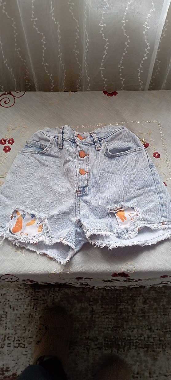 Düğmeli kapamalı, nakış detaylı bol kesim denim şort. Kısa, yırtık uçlu ve pastel desenli parçalar içerir. Günlük sokak stili için uygundur.