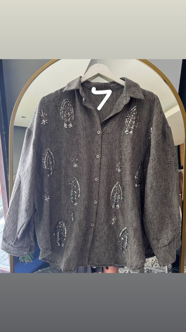 Düğmeli, uzun kollu keten gömlek, nakışlı desenlerle süslenmiş. Bohem tarzda, yakalı ve bol kesim, kahverengi tonlarında.