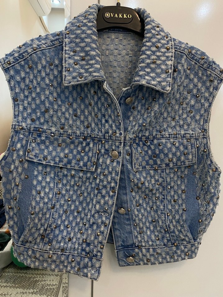 Düğmeli Nakışlı Crop Kot Ceket