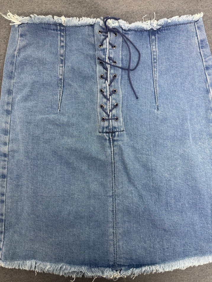 Kuşgözü bağcık detaylı, fitted kesim denim mini etek. Püsküllü kenarları ve bohem tarzıyla outdoor kullanım için uygun.