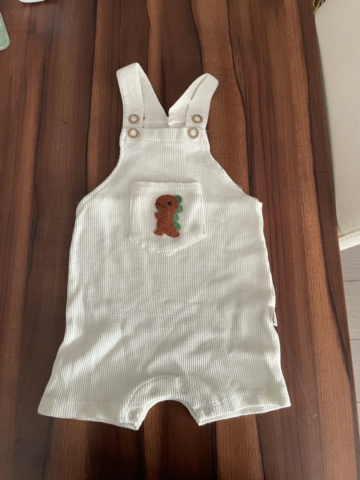 Yumuşak triko kumaştan yapılmış, fitted kesim, kolsuz erkek çocuk tulumu. Ön cepte düğmeli ve nakışlı desen bulunur, sokak stili için uygun. 6-9 ay uyumlu