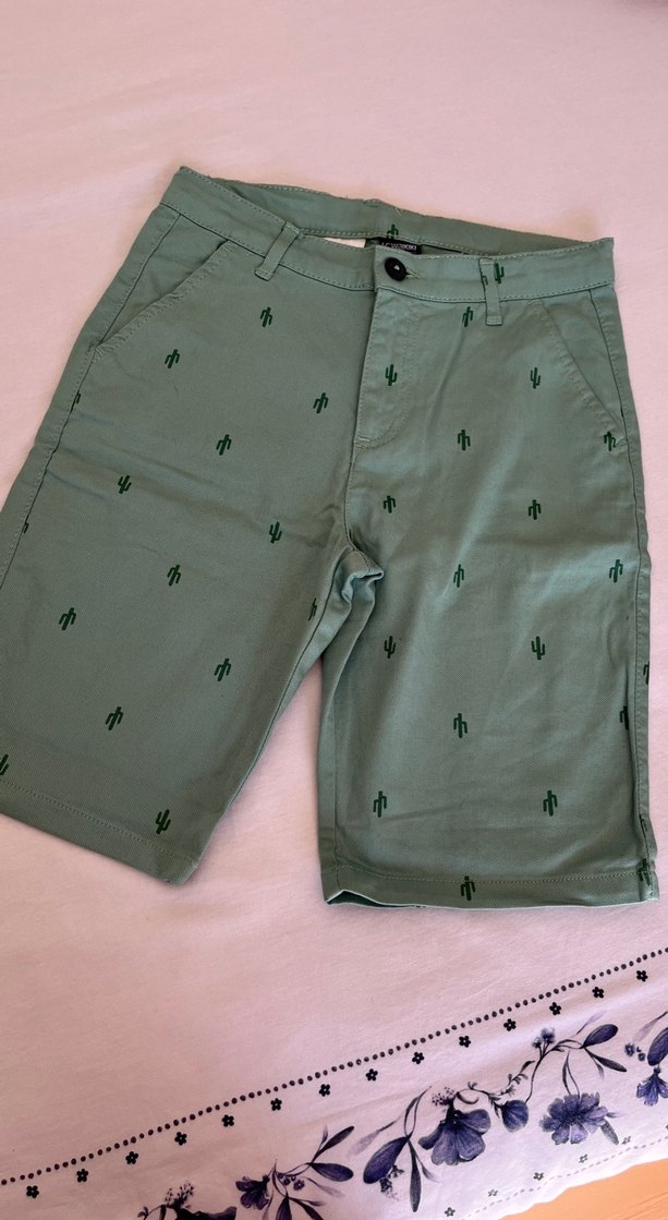Düğmeli kapama ve yan ceplere sahip, yeşil sentetik kumaştan, nakışlı kaktüs desenli, regular fit erkek şort.